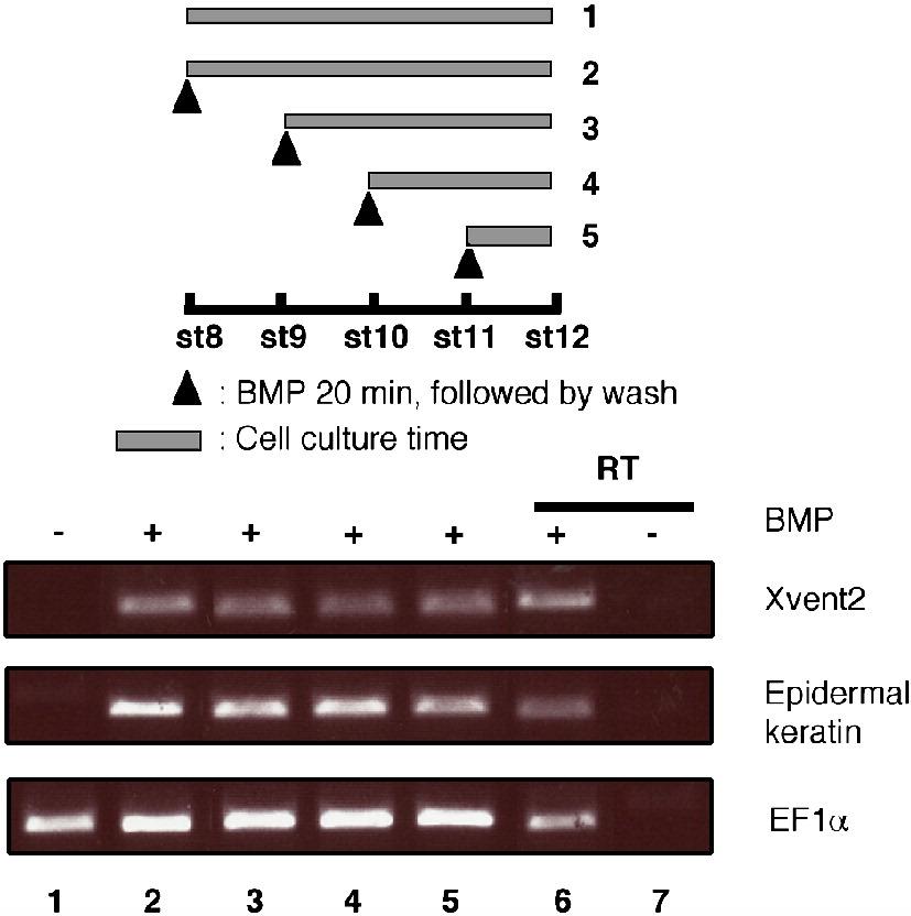 Fig. 1. Dissociated animal cap cells are competent to receive a BMP signal at stages 8, 9, 10 and 11. Dissociated animal cap cells from normal embryos were treated for 20 min with 2 μg/ml of BMP4 at stage 8 (lane 2), stage 9 (lane 3), stage 10 (lane 4) and stage 11 (lane 5), washed and cultured until stage 12. RT-PCR was then carried out to test the expression of Xvent2 and epidermal keratin. RT-PCR positive and negative samples were loaded (lanes 6 and 7, respectively). EF1α is the loading control. |