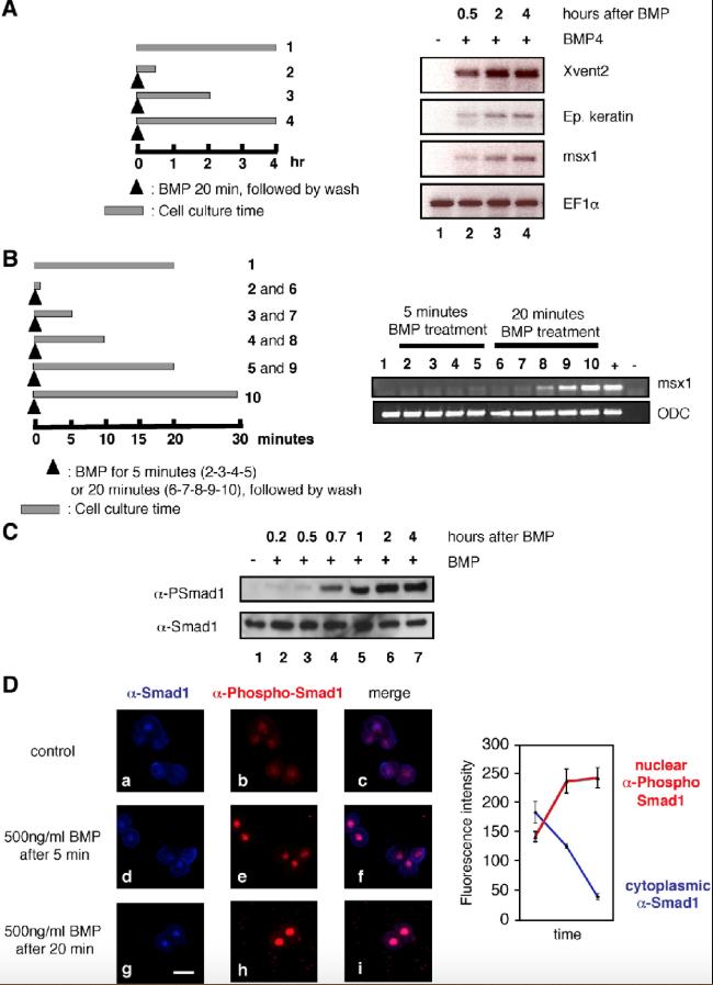 Fig. 2. Smad1 is phosphorylated and gene transcription initiated within half an hour after BMP treatment at stage 8. (A) Immediate transcription of Xvent2, epidermal keratin and msx1 genes is observed within an hour after the BMP treatment in normal embryos. Dissociated cells were exposed to BMP for 20 min, then washed and cultured for the indicated length of time (left panel). Dissociated animal cap cells were incubated in the absence (lane 1) or in the presence of 2 μg/ml of BMP4 for 20 min and cultured for the times shown (right panel, lanes 2, 3 and 4). Xvent2, epidermal keratin and msx1 are expressed within an hour of BMP presentation. EF1α is the loading control. (B) The timing of gene expression after BMP treatment. Left panel, dissociated animal cap cells were collected at stage 8, treated without BMP (lane 1) or with 2 μg/ml BMP for 5 min (samples 2 to 5) or 20 min (samples 6 to 10) and incubated for 0 (lanes 2 and 6), 5 (lanes 3 and 7), 10 (lanes 4 and 8), 20 (lanes 5 and 9) and 30 min (lane 10). Right panel, msx1 starts to be expressed after 20 min of BMP exposure plus 5-min incubation, 30 min in total after BMP presentation (lane 8). ODC is the loading control. (C) Western blot analysis of animal caps from normal embryos, treated with 2 μg/ml of BMP for 20 min. Five animal caps were loaded per lane. Antibodies recognized total or phosphorylated Smad1, αSmad1 or αPSmad1, respectively. Samples were frozen 15 min (lane 2), 30 min (lane 3), 45 min (lane 4), 1 h (lane 5), 2 h (lane 6) and 4 h (lane 7) after BMP treatment. (D) Smad1 activation in Xenopus animal cap cells in the presence of BMP. Left, dissociated animal cap cells were cultured on fibronectin coated slides, treated at stage 8 with 500 ng/ml BMP for either 5 or 20 min and immediately fixed. Cells were then stained with anti-Smad1 and anti-phosphoSmad1 antibodies. After 20 min most of the Smad1 pool is phosphorylated and localized into the nucleus. Scale bar, 30 μm. Right, a line chart to show changes in nuclear and cytoplasmic Smad1 over time. |