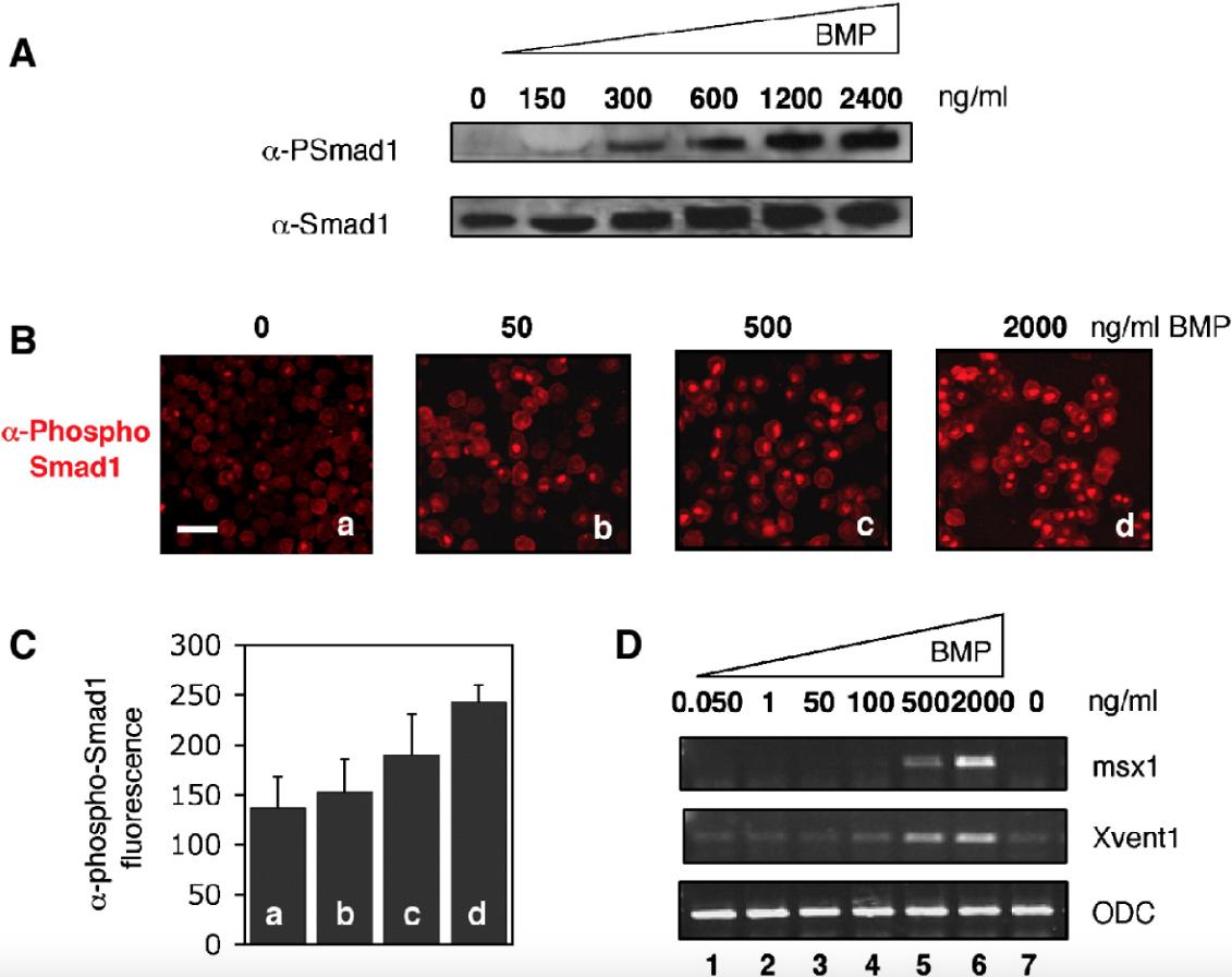 Fig. 3. Smad1 phosphorylation state reflects quantitatively the gene expression level. (A) Increasing concentrations of BMP ligand induce an increased amount of phosphorylated Smad1. Dissociated animal cap cells were treated with different concentrations of BMP as shown. Activation of Smad1 was measured by Western blot using anti-phospho-Smad1 antibody (α-PSmad1). The total amount of Smad1 protein has been visualized using anti-Smad1 antibody (α-Smad1). (B) The Smad1 phosphorylation level reflects the BMP concentration received by a cell. Cells were cultured on fibronectin-coated slides, treated with 0 (panels a), 50 (panel b), 500 (panel c) and 2000 (panel d) ng/ml BMP, fixed with 4% paraformaldehyde and analyzed by immunofluorescence using an antibody against the phosphorylated form of Smad1 (α-PSmad1). Scale bar, 60 μm. (C) Quantitation of nuclear fluorescence. The average nuclear α-phospho-Smad1 fluorescence intensity of panels aâd has been measured and is represented by bars a, b, c and d, respectively. Each bar represents the mean value ± SD of the intensity of nuclear Smad1 in about 100 cells. (D) The extent of gene expression is proportionate to BMP concentration. Animal cap cells were treated with 50 pg/ml (lane1), 1 ng/ml (lane2), 50 ng/ml (lane3), 100 ng/ml (lane4), 500 ng/ml (lane 5) and 2000 ng/ml (lane 6) BMP or no BMP (lane 7). msx1 and Xvent1 were analyzed. ODC is the loading control. |