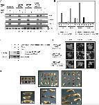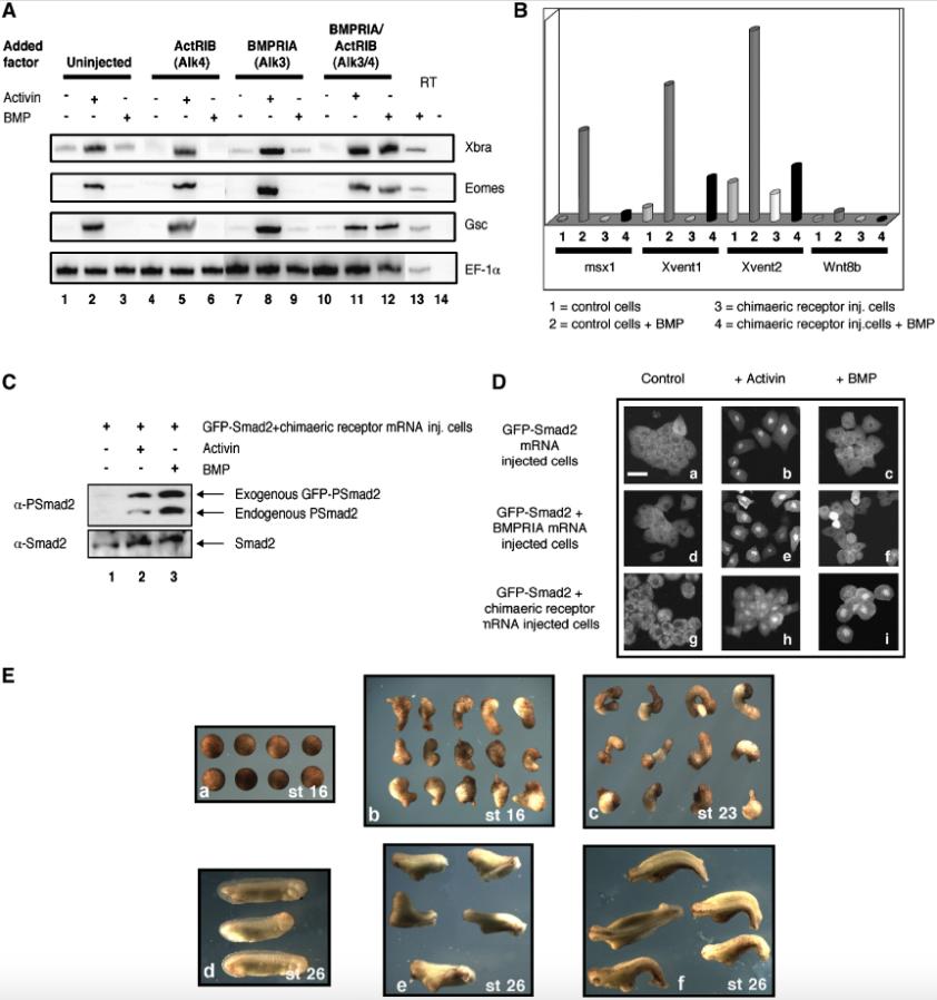 Fig. 6. The cloned chimeric receptor is functional. (A) Induction of early mesodermal markers in chimeric receptor injected animal cap cells. Embryos were injected at the 2-cell stage with 4 ng of mRNA encoding the activin receptor type IB (ActRIB), BMP receptor type IA (BMPRIA) and the chimera BMPRIA/ActRIB. Five animal caps were collected at stage 8.5 and cultured to stage 10 before being treated with 2 μg/ml BMP or 10 ng/ml activin for 20 min; EF1α is the loading control; uninjected, control caps from uninjected embryos. (B) Inhibition of BMP-responsive genes in chimeric receptor injected animal cap cells after BMP4 treatment. Five animal caps from chimeric receptor mRNA injected embryos (bar 4) and five animal caps from control embryos (bar 2) were collected at stage 8.5 and treated with 2 μg/ml BMP for 20 min at stage 10. Five animal caps from chimeric receptor mRNA injected embryos (bar 3) and five animal caps from control embryos (bar 1) were not treated with BMP. RT-PCR was performed to test the expression of msx1, Xvent1, Xvent2 and Wnt8b. (C) GFP-Smad2 is phosphorylated and accumulated in the nucleus in chimeric receptor mRNA injected cells after BMP treatment. Western blot analysis of the phosphorylated form of Smad2 in the chimeric receptor + GFP-Smad2 mRNAs co-injected cells in the presence of BMP. Ten animal caps per lane were loaded and analyzed using an antibody against phospho-Smad2 (α-PSmad2). Both the exogenous and the endogenous forms of Smad2 are detected. Smad2 (α-Smad2) was used as loading control for total protein. (D) Confocal analysis of the GFP-Smad2 nuclear translocation. Two-cell stage embryos were injected at the animal pole with the indicated constructs. The injected animal caps were collected at stage 8, treated for 20 min with 2μg/ml of BMP or 10 ng/ml of activin at stage 10, dissociated and cultured on fibronectin slides. In the unstimulated state GFP-Smad2 was localized in the cytoplasm (panels a, d and g). In the presence of activin, GFP-Smad2 accumulated in the nucleus (panels b, e and h). After BMP treatment only the chimeric receptor + GFP-Smad2 mRNAs co-injected cells showed the nuclear localization of GFP-Smad2 (panel i). Scale bar, 40 μm. (E) Elongation of animal cap explants and double axes in embryos in response to the overexpression of the chimeric receptor. Control animal caps (panels a) and 0.8 ng chimeric receptor mRNA injected caps (panels b and c) were collected at stage 8 and cultured in 1X MBS until the stages shown. Control embryos (panel d) and 0.8 ng chimeric receptor mRNA ventrally injected embryos at the 4-cell stage (panels e) and at the 16-cell stage (panel f) were cultured until stage 26 and analyzed for the presence of a double axis. The presence of endogenous BMP is sufficient to induce elongation in explanted animal caps and full (panel e) or partial (panel f) double axes in embryos. |