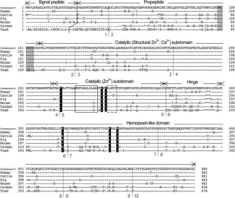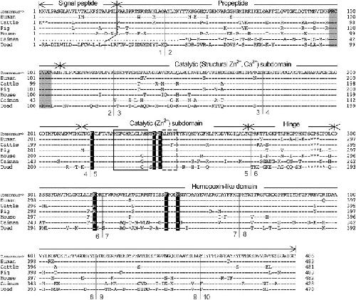 Amino acid sequence alignment of MMP20 genes from human, bovine, porcine, mouse, caiman, and toad specimens. Amino acid residues are shown with the IUPAC-IUB single letter code. Numbering shows residue positions. Identity with the simple majority consensus sequence at the top is indicated by a dash (-) and deletions introduced for optimal alignment by asterisks (⁎). Vertical lines indicate exon borders of the human, mouse, caiman, and toad MMP20 genes, and numbers on the both sides of the line denote exon numbers. The cysteine switch motif is indicated by grizzled boxes. The conserved signature for the catalytic zinc ion binding site is indicated by the open box with solid lines and the following methionine turn motif is surrounded by a box with dotted lines. The white letters on shaded backgrounds represent the unique combination of amino acid residues for the MMP20 molecules.