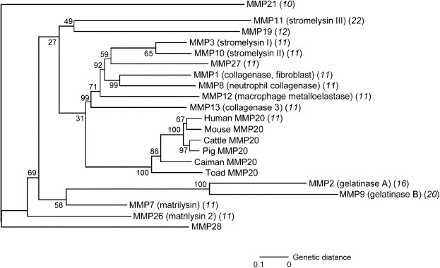 Neighbor-joining tree of amino acid sequences of MMP20 proteins. All MMP sequences except for MMP20 are used as representatives of human sequences. The numbers enclosed in parentheses represent an available chromosomal origin for human MMPs. The scale bar represents the distance based on the proportion of amino acid differences. Gapped sites were removed from all sequences before distance estimates were made. Numbers on the nodes indicate the percent recovery of that node in 1000 bootstrap replications.