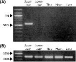RT-PCR analysis of toad tissues. (A) cDNA was amplified from upper jaw, lower jaw, tibia, heart, and liver specimens, using the MMP20 cDNA-specific primer sets MMPX10 and MMPX15. (B) cDNA was amplified with the primers GAPDH1 and GAPDH2, with the results used as a positive control.