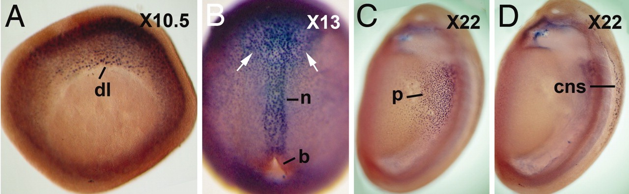 Localization of specific mRNAs in Xenopus embryos by whole-mount in situ hybridization.