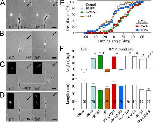 Figure 7. BMP7-induced bidirectional turning of the growth cones depends on the phosphorylation regulation of ADF/cofilin activity. (A and B) Mean turning angles (top) and lengths of net extension (bottom) of different groups of the growth cones examined in 4–8-h cultures (A) and overnight cultures (B). Numbers indicate the total numbers of growth cones examined for each condition. Asterisks indicate significant differences from the corresponding control group (*, P < 0.01; Mann-Whitney test). Error bars represent SEM. |