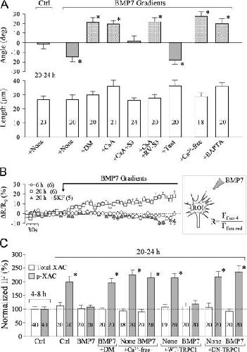 Figure 8. BMP7-induced repulsion in overnight neurons requires Ca2+–CaN signaling. (A) Mean turning angles (top) and lengths of net extension (bottom) of different groups of growth cones examined in overnight cultures. DM, deltamethrin; CsA, cyclosporine A; Taut, tautomycin. The bars filled with a pattern show the turning responses switched from repulsion to attraction. Asterisks indicate statistical significances compared with the control (*, P < 0.01; Mann-Whitney test). (B) Ratiometric imaging of changes in [Ca2+]i upon the onset of BMP gradients. The graph depicts the relative changes in fluo-4 and fura red ratios (ΔR/R0). The numbers in parentheses indicate the numbers of growth cones examined for each condition. 2 μM SKF96365 was added to the bath 20 min before imaging. The increase in ΔR/R0 became statistically significant 1 min after the onset of the BMP gradient (P < 0.05; t test). ROI, region of interest. (C) Normalized levels of p-XAC and XAC in Xenopus growth cones of 4–8-h cultures and overnight cultures with and without bath BMP7 exposure (5 nM for 10 min) under different manipulations of the Ca2+ signaling pathway. Asterisks indicate values that are significantly different from the control (*, P < 0.01; t test). (A and C) The numbers of growth cones examined for each condition are shown on each bar. Error bars represent SEM. |