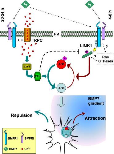 Figure 10. Schematic diagram illustrating the signaling mechanisms that control the bidirectional responses of the growth cone to BMP7 gradients. In 4â8-h neurons, BMP7 induces an attractive response through the LIMK pathway. In overnight neurons, BMP7 repels the growth cone through the CaNâSSH phosphatase pathway, which is activated by Ca2+ signaling through TRP channels. ADF/cofilin acts as the common downstream target of these two signaling pathways to locally regulate the actin cytoskeleton for distinct turning responses. PM, plasma membrane. |