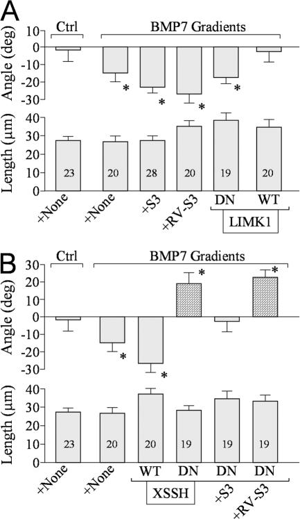 Figure 4. BMP7-induced repulsion in overnight cultures is mediated by SSH phosphatase. (A and B) The bar graphs summarize the mean turning angles (top) and net extension (bottom) of different groups of growth cones examined for the involvement of LIMK (A) and SSH (B) in overnight cultures. The numbers of growth cones examined for each condition are indicated on each bar. Asterisks indicate significant differences from the corresponding control (*, P < 0.05; Mann-Whitney test). (B) The bars filled with a pattern show the turning responses switched from the original one (repulsion to attraction in this case). Error bars represent SEM. |
