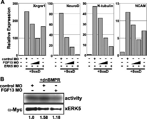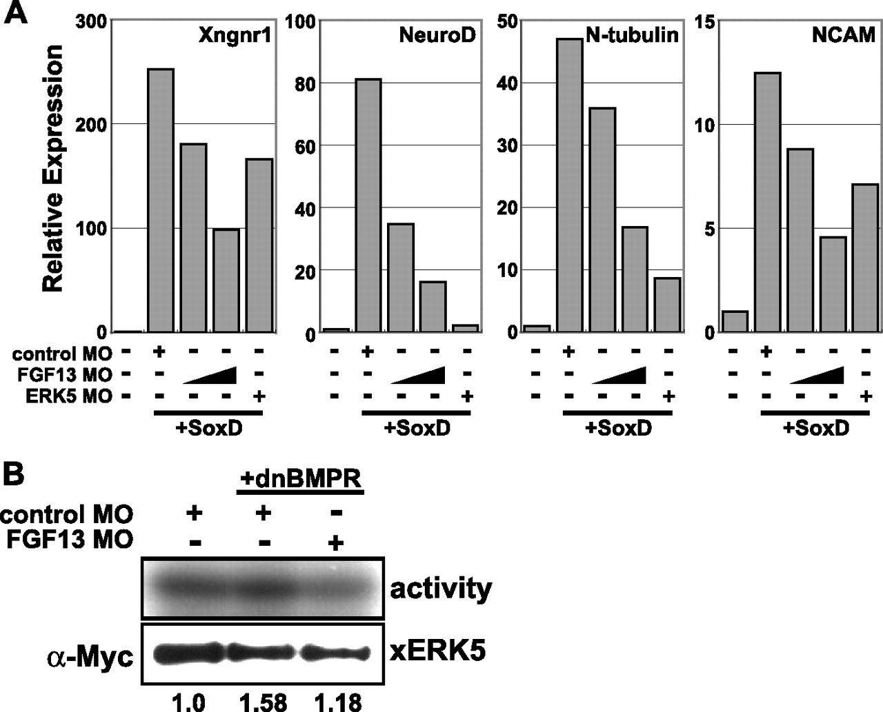 In Xenopus embryonic development, the MEK5-ERK5 pathway, one of the MAPK pathways, lies downstream of SoxD and upstream of Xngnr1 in a signaling pathway regulating neural differentiation. It remains unclear, however, how the MEK5-ERK5 pathway is regulated in Xenopus neural development. As SoxD is a transcription factor, we hypothesized that some growth factor should be induced by SoxD and activate the MEK5-ERK5 pathway. As the expression level of fibroblast growth factor 13 (FGF13) is increased by SoxD, we analyzed the function of FGF13 in neural development. Knockdown of FGF13 with antisense morpholino-oligonucleotides (MOs) results in the reduced head structure and inhibition of neural differentiation. FGF13 MOs inhibit the SoxD-induced expression of Xngnr1 and the Xngnr1-induced expression of NeuroD, suggesting that FGF13 is necessary both upstream and downstream of Xngnr1 in neural differentiation. In addition, FGF13 MOs inhibit the activation of the MEK5-ERK5 pathway by dominant-negative bone morphogenetic protein receptor, a mimicker of neural inducers, indicating that FGF13 is involved in the activation of the MEK5-ERK5 pathway. Together, these results identify a role of FGF13 in Xenopus neural differentiation.