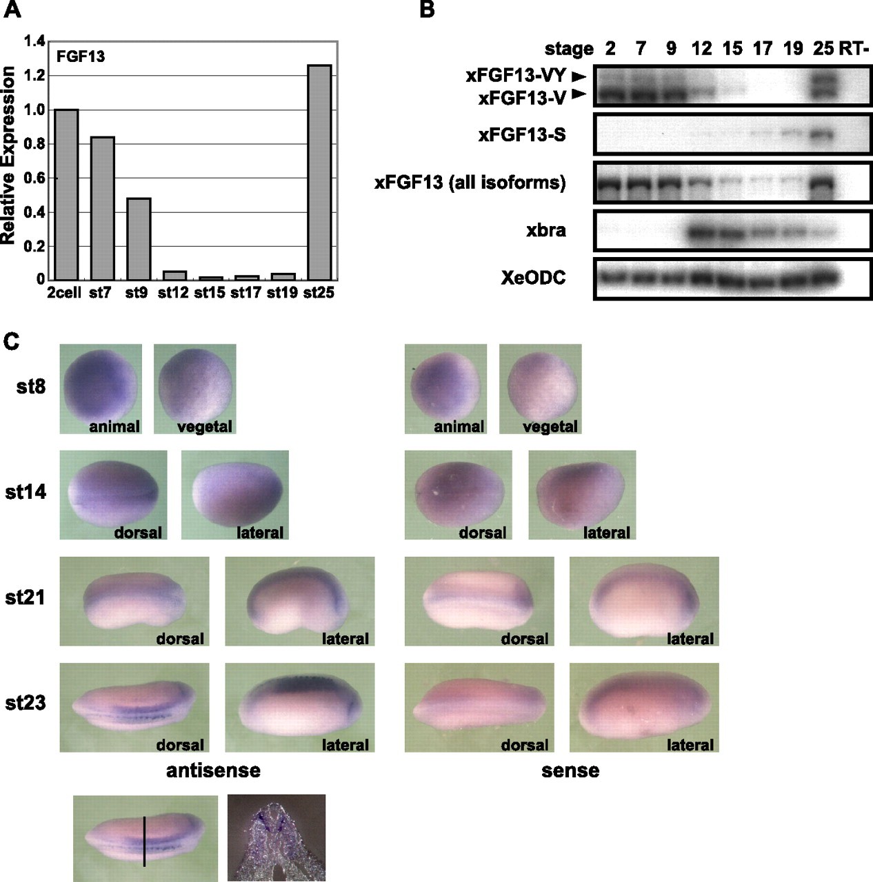 Expression pattern of xFGF13.A, total RNA was isolated from embryos at the indicated stages, and expression of xFGF13 was analyzed by real time PCR. B, expression of each isoform of xFGF13 was analyzed by semiquantitative RT-PCR. XeODC was used as an RNA loading control. Xbra was also examined. C, whole-mount in situ hybridization against xFGF13 at the indicated stages.