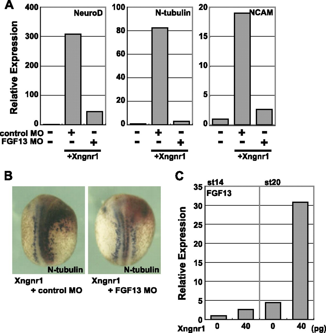 xFGF13 also functions downstream of Xngnr1.A, Xngnr1 mRNA (40 pg) was injected with control MO (60 ng) or FGF13 MO1 (30 ng) plus MO2 (30 ng). Animal caps were cultured to stage 20 and analyzed by real-time RT-PCR. B, Xngnr1 mRNA (40 pg) was injected with control MO (60 ng) or FGF13 MO1 (30 ng) plus MO2 (30 ng) into the right blastomeres of four-cell stage embryos. Expression of N-tubulin was analyzed by whole-mount in situ hybridization. C, Xngnr1 mRNA (40 pg) was injected, and animal caps were cultured to the indicated stages. An expression level of xFGF13 mRNA was analyzed by real time RT-PCR.