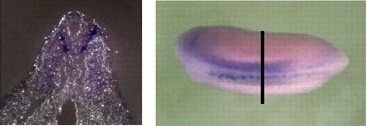 fgf13 (fibroblast growth factor 13 ) gene expression in Xenopus laevis embryo, assayed via in situ hybridization, NF stage 23, transverse section, mid trunk section, dorsal up ( left image) and dorsal view, anteriorleft (right image).