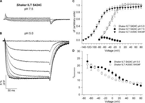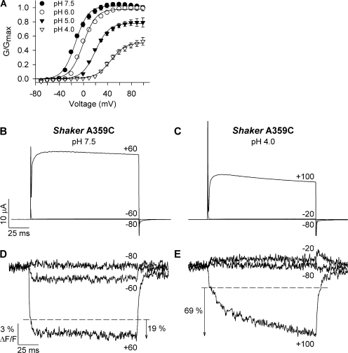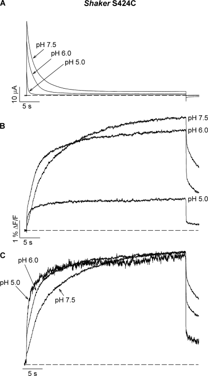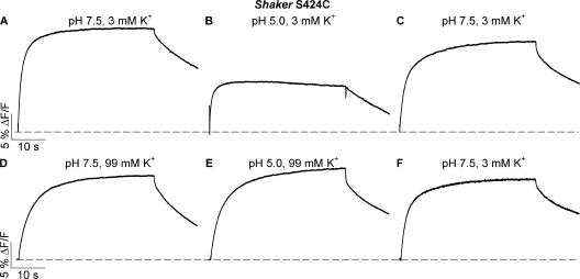 Lowering external pH reduces peak current and enhances current decay in Kv and Shaker-IR channels. Using voltage-clamp fluorimetry we directly determined the fate of Shaker-IR channels at low pH by measuring fluorescence emission from tetramethylrhodamine-5-maleimide attached to substituted cysteine residues in the voltage sensor domain (M356C to R362C) or S5-P linker (S424C). One aspect of the distal S3-S4 linker alpha-helix (A359C and R362C) reported a pH-induced acceleration of the slow phase of fluorescence quenching that represents P/C-type inactivation, but neither site reported a change in the total charge movement at low pH. Shaker S424C fluorescence demonstrated slow unquenching that also reflects channel inactivation and this too was accelerated at low pH. In addition, however, acidic pH caused a reversible loss of the fluorescence signal (pKa = 5.1) that paralleled the reduction of peak current amplitude (pKa = 5.2). Protons decreased single channel open probability, suggesting that the loss of fluorescence at low pH reflects a decreased channel availability that is responsible for the reduced macroscopic conductance. Inhibition of inactivation in Shaker S424C (by raising external K(+) or the mutation T449V) prevented fluorescence loss at low pH, and the fluorescence report from closed Shaker ILT S424C channels implied that protons stabilized a W434F-like inactivated state. Furthermore, acidic pH changed the fluorescence amplitude (pKa = 5.9) in channels held continuously at -80 mV. This suggests that low pH stabilizes closed-inactivated states. Thus, fluorescence experiments suggest the major mechanism of pH-induced peak current reduction is inactivation of channels from closed states from which they can activate, but not open; this occurs in addition to acceleration of P/C-type inactivation from the open state.