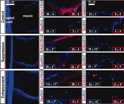 Fig. 2. Activity-dependent neurotransmitter expression in presynaptic terminals in the axial musculature. Whole mounts from control and activity-manipulated 3-day (stage 40) larvae were immunolabeled for a presynaptic marker, SV2 (in blue), and for transmitter phenotype (in red): VAChT (cholinergic), glutamate (glutamatergic), GABA (GABAergic), and glycine (glycinergic). (Left) Low magnification images are representative Z series projections obtained from confocal stacks of 50 optical sections of 44,100 μm2 area of muscle and spinal cord. (Center and Right) High magnification images are representative Z series projections of five optical sections of muscle from the top of the same stacks. n = 5 embryos for each transmitter phenotype. (Insets) Numbers of synaptic puncta labeled for SV2 and for transmitter per 33,443 μm2 area of muscle. Values are mean ± SEM for n = 5 single optical sections per probe from five embryos. â, P < 0.05 compared with control. |