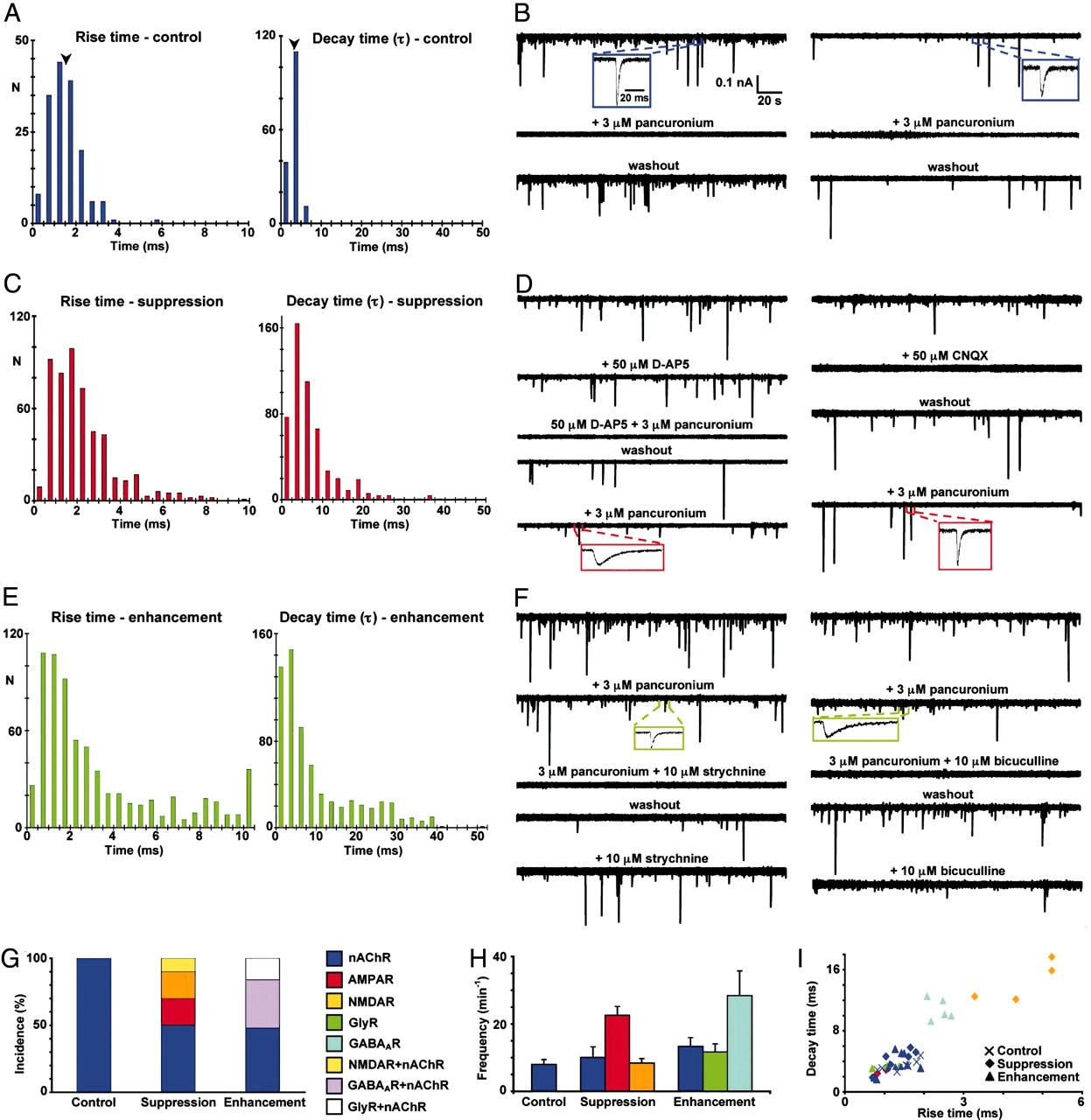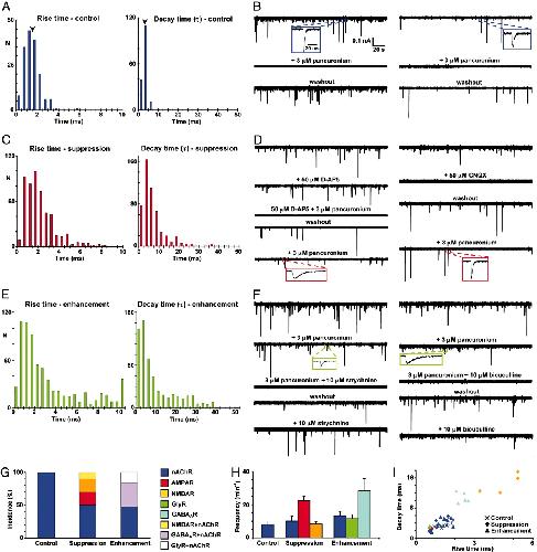 Fig. 3. Matching of neurotransmitters and receptors at neuromuscular junctions in vivo. Whole-cell recordings from muscle cells of the axial musculature of 3-day (stage 40) control (A and B), Ca2+ spike-suppressed (C and D), and Ca2+ spike-enhanced (E and F) larvae were performed in the presence of 2 mM Ca2+, Mg2+-free saline, and 3 μM TTX; V h = â80 mV. (A, C, and E) Rise and decay time distributions for mpscs, including only mpscs with decay times fit by single exponentials. N, number of mpscs (â¥6 embryos for each group). Arrowheads in A indicate mean values. (B, D, and F) Examples of pharmacological blockade of mpscs from two muscle cells in each group of embryos. Single mpscs are shown on an expanded time base to illustrate their kinetics. (G) Incidence of cholinergic, glutamatergic, GABAergic, and glycinergic NMJs. Bars represent the percent of each class of NMJ in each group based on blockade by different receptor antagonists. Bars represented by a single receptor are derived from NMJs in which mpscs were blocked completely by a single receptor antagonist. Bars corresponding to two receptors are derived from NMJs in which mpscs were blocked completely only by the combination of two receptor antagonists. (H) Frequencies of pharmacologically isolated mpscs in each group. Values are mean ± SEM. (I) Rise and decay times for pharmacologically identified mpscs. Ã, control; â, spike-suppressed; âµ, spike-enhanced. Each point is the mean rise time and decay time for mpscs recorded from a single muscle cell. (GâI) Values are from 6 control, 12 spike-suppressed, and 13 spike-enhanced NMJs. |