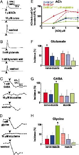 Fig. 4. Sensitivity of uninnervated muscle cells to ACh, glutamate, GABA, and glycine depends on neuronal Ca2+ spike activity in vitro. Muscle cells cocultured with neurons (nerve-muscle) and muscle cells cultured alone (muscle) for 18â24 h were loaded with a fluorescent Ca2+ indicator or Clâ sensor dye to image responses to ACh and glutamate or GABA and glycine, respectively. Imaging was performed in 2 mM Ca2+ culture medium. Glutamate responses were recorded in the presence of 10 μM curare or 3 μM pancuronium to exclude indirect nAChR-mediated responses. (AâD) Traces are responses of uninnervated single muscle cells to neurotransmitters applied at times indicated by arrowheads. (EâH) Analysis of the incidence of responses to transmitters under different culture conditions. â, P < 0.01 when compared with the 2 mM Ca2+ condition for nerve-muscle cultures. (E) Solid lines represent nerve-muscle cultures, and dashed lines represent muscle cultures. Values are mean ± SEM from >40 cells from five independent cultures for each transmitter. |