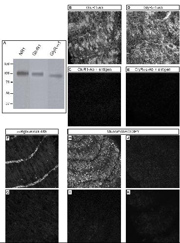 Fig. 5. Specificity of neurotransmitter receptor labeling in vivo. (A) Western blot with antibodies used for immunohistochemistry demonstrates bands of predicted molecular mass. Expected subunit receptor sizes are 102 kDa (NR1), 95 kDa (GluR1), and 89 (GlyRα1). (B-E) Staining of 1.3-day (stage 28) embryos with anti-GluR1 and anti-GlyRα1 is prevented by preincubation of the primary antibody with antigen. (F and G) Labeling of axial musculature by 5 mg/ml α-Bgtx-Alexa 488 in 3-day (stage 40) larvae (F) is blocked by 150 mg/ml cold α-Bgtx (G). (H-K) Labeling by 100 nM muscimol-BODIPY in stage 28 larvae (H) is blocked by 10 μM unlabeled muscimol (I), 20 μM bicuculline (J), or 20 μM gabazine (K). |