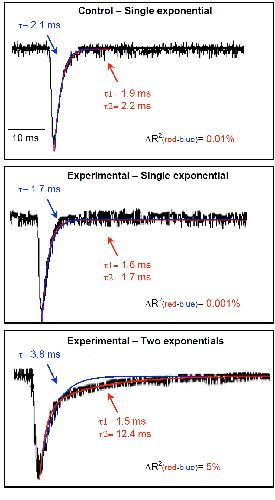 Fig. 6. Fit of mpscs decay times at neuromuscular junctions in vivo. Examples of mpscs taken from recordings (black traces) from control and experimental neuromuscular junctions of stage 40 larvae. Fits of decay times with one exponential (blue trace) and two exponentials (red trace) were performed with the MiniAnalysis Program (Synaptosoft Inc, Decatur, GA). Two exponentials were considered better than one when the change in R2 was >1%. Of the 54 neuromuscular junctions examined in experimental animals, 35 had both monophasic (mean of 82%) and biphasic (mean of 18%) responses, and the rest had monophasic responses alone. Neuromuscular junctions in control embryos did not exhibit biphasic responses. |