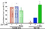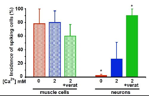 Fig. 7. The incidence of spontaneously generated Ca2+ transients in muscle cells cultured alone or with neurons is unaffected by conditions that alter neuronal Ca2+ spike activity. Cells were loaded with a Ca2+ sensor dye (2 μM Fluo-4AM) at 18-24 h in vitro and imaged at 0.2 Hz. The histograms illustrate the incidence of Ca2+ transients in muscle cells and neurons in Ca2+-free, 2 mM Ca2+, or 2 mM Ca2+ plus 1 μM veratridine medium. There was no difference between muscle cells cultured alone and those cocultured with neurons, and results are presented together. Values are mean ± SEM for >40 cells from five independent cultures for each group. *, P < 0.01 when compared to the 2 mM Ca2+ condition. |