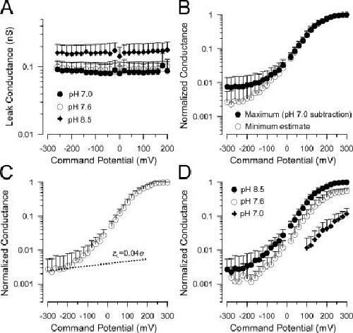 Figure 6. Voltage dependence of Slo3 conductance at negative potentials. In A, the voltage dependence of leak conductance in inside-out patches from DEPC-injected oocytes is displayed at each of three pH, 7.0, 7.6, and 8.5. The increase in leak conductance with increases in pH is not associated with any visually observable increase in current variance. In B, the voltage dependence of Slo3 conductance over the range of −300 to +300 mV is shown for two different methods of correction for leak current. Solid circles correspond to conductance estimates in which the leak conductance observed at pH 7.0 was subtracted on a patch by patch basis from the conductance observed at pH 8.5. This represents the maximum possible estimate of the Slo3 conductance at negative potentials. Open symbols correspond to conductance estimates derived from defining a linear leak conductance at pH 8.5 based on the most positive current over voltages from −100 through −240 mV (as illustrated in Fig. 6). This represents the minimal possible estimate of Slo3 conductance at negative potentials. In C, Slo3 conductance estimates at pH 8.5 over the range of −300 through −220 mV were fit by G(V) = L(0)*exp(zL*V/kT), yielding an estimate of zL of 0.04 ± 0.08. After conversion of normalized conductance to absolute Po (Zhang et al., 2006), L(0) was 1.25 ± 0.10 * 10−3. In D, the log(G) vs. V relationships for pH 8.5, 7.6, and 7.0 are shown. |