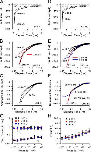 Figure 13. Dependence of deactivation on voltage and pH. In A, tail currents at pH 8.5 are shown on a linear time scale for −40, −120, and −200 mV. In B, traces from A are shown on a logarithmic time scale along with a two component exponential fit (red lines) to the decay process. In C, tail currents from B were normalized to their maximum amplitude to illustrate the decrease in the relative amplitude of the slow exponential component at more negative potentials. In D, tail currents at −200 mV are compared for pH 7.6, 8.0, and 8.5. In E, the traces in D are plotted on a logarithmic time scale. For the example at pH 8.5, the best fit of a single exponential function (blue line) and a two component exponential function (red line) are compared. Time constant for the single exponential fit was 0.28 ms, while for the two component fit, τf = 38 μs and τs = 0.89 ms. In F, normalized tail currents at −200 mV, but at different pH, show a similar time course. Fits are as in E. In G, slow (τs) and fast (τf) time constants from tail currents are plotted as a function of potential for pH 7.4, 8.0, and 9.0. For τf, the line corresponds to τf(V) = τf(0)exp(zV/kT), where τf(0) = 0.071 ± 0.004 μs and z = 0.147 ± 0.01 e. In H, the voltage dependence of the contribution (percent) of the slow component to the tail current is shown for pH 7.4, 8.0, and 9.0. |