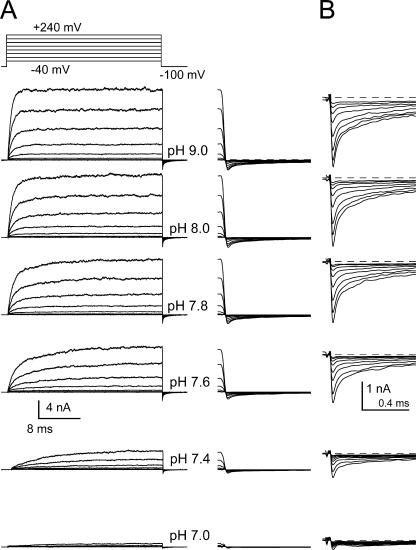 Figure 1. Increases in pH result in increased Slo3 current activation. (A) An inside-out patch expressing Slo3 channels was bathed with 0 Ca2+ solutions with pH set to the indicated nominal values. Patches were activated by the indicated voltage protocol. Minimal current activation is observed with pH 7.0 even at +240 mV. Increases in pH result in faster and more robust current activation. (B) Tail currents from the panels in A are shown on a faster time base on the left and with larger amplification on the right. Note that even at the highest pH, the tail currents do not exhibit saturation in activation of conductance. |