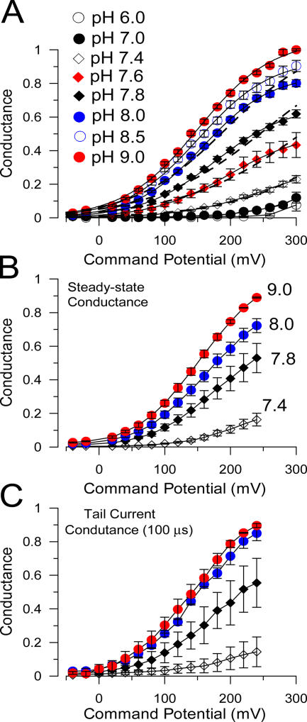 Figure 2. pH dependence of Slo3 macroscopic conductance. In A, steady-state currents were measured from records as in Fig. 1 and converted to conductances. For results from any individual patch, G/V curves were normalized to the maximal conductance observed with pH 9.0. The full set of pH was not tested on all patches, but each point is the mean of 4–18 patches. In B and C, macroscopic conductance was determined both from steady-state currents (B) or tail currents (C) for a set of four patches at pH of 7.4, 7.8, 8.0, and 9.0. For tail current G/Vs a single current value at 100 μs after the nominal onset of the voltage step was used. |