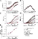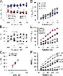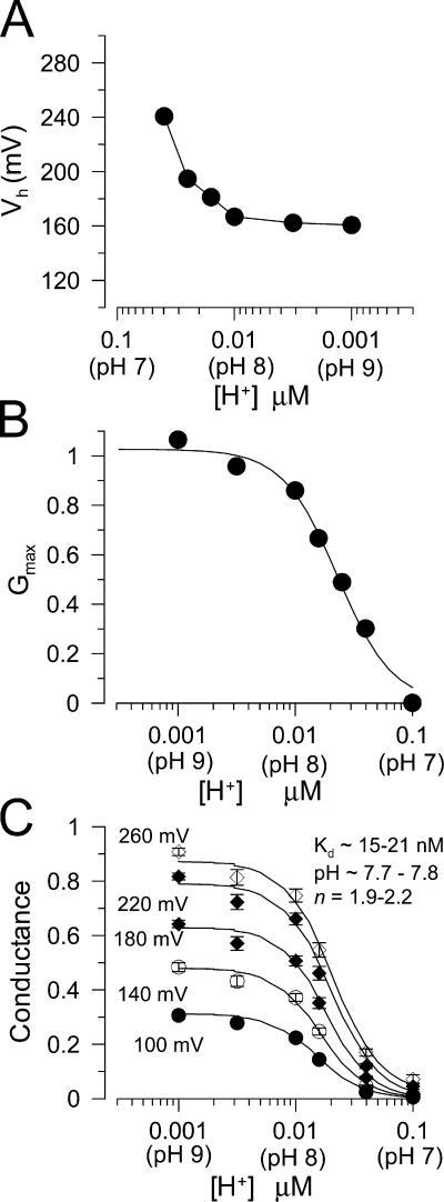 Figure 3. Empirical properties of Slo3 G/V curves. In A, the voltage of half activation (Vh) is plotted as a function of proton concentration. Vh estimates were based on Boltzmann fits (Eq. 1) in which Gmax was not constrained. In B, Gmax obtained from fits of Eq. 1 to G/V curves at each pH are plotted as a function of [H+]. The solid line is a fit of Hill equation (G([H+]) = Gmax/{1 + ([H+]/Kd)n}), yielding an effective Kd of 23.3 ± 2.9 nM and with n = 1.9 ± 0.4. In C, the normalized conductance is plotted as a function of [H+] for a range of command potentials. Solid lines show the best fit of a similar Hill function to conductance estimates at each voltage. The range of estimates for Kd was 15–21 nM corresponding to pH of 7.7–7.8, with minimal voltage dependence in the estimates. Estimates of n ranged from 1.9 to 2.2. |