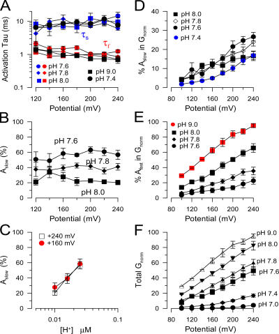 Figure 11. Properties of two components of slo3 activation. In A, fast (red) and slow (blue) time constants of activation at the indicated pH are plotted as a function of activation potential. Error bars are SEM of seven to eight estimates. The single exponential described activation at pH 9.0 closely approximates the fast time constant of activation, while the single exponential describing activation at pH 7.4 approximates the slow time constant. The fast time constant appears to become somewhat faster with depolarization. In B, the percent of the slow activation component is plotted as a function of voltage for three different pH. The relative contribution of the slow component does not change with command potential, but decreases with increases in pH. In C, the percent of the slow component is plotted as a function of pH for two different voltages. The percent of the slow component increases as pH is decreased. At pH 7.4, slow component contribution approaches 100%, while at pH 9.0, it is less than 5%. In D, the absolute contribution of the slow component to normalized conductance is plotted as a function of voltage for different pH. In E, the contribution of the fast component to conductance is plotted as a function of voltage for different pH. All conductance values in D and E were normalized within patches to the maximum conductance observed at pH 9.0. In F, the voltage dependence of the sum of the fast and slow component of conductance is illustrated, approximating the macroscopic steady-state G/Vs. |