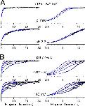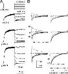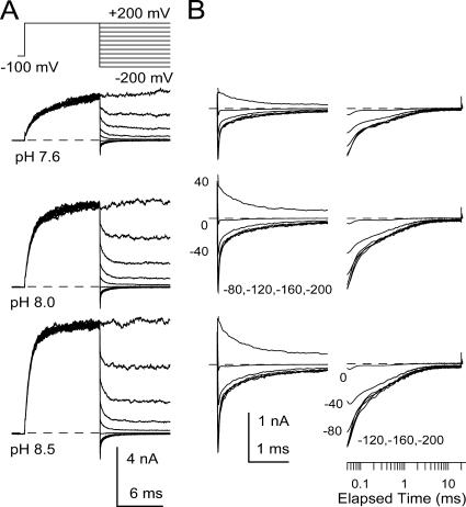 Figure 12. Slo3 deactivation contains two components. In A, the indicated voltage step protocol was used to examine tail current properties at potentials from −200 to +180 at various pH as indicated. Peak tail current at −200 mV is markedly nonohmic in comparison to current at +200 mV. 50 kHz sampling rate; 10 kHz filter. In B, the tail currents in A at potentials from +40 to −200 mV shown on a faster time base to emphasize the fast and slow components of the decay process. Traces on the left are shown on linear time scale, while those on the right are plotted on a logarithmic time scale. |
