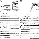Figure 4. There is appreciable pH-dependent Slo3 current at negative potentials. In A, families of Slo3 currents activated by the indicated voltage protocol are shown for pH 7.0 and 8.5. Test steps to potentials from −300 to +300 mV were preceded by a conditioning step to −100 mV. Each trace corresponds to a single sweep. In B, high gain records for traces in A at negative potentials are displayed on a faster time base showing the absence of channel activity at pH 7.0. In each case, a brief period at 0 mV preceded the step to −100 mV, before the final test step. In C, similar traces at pH 8.5 show increased variance due to channel activity. In D, current traces for the same range of voltages at pH 7.0 are shown for an inside-out patch from an oocyte injected with DEPC. In E, traces are from the same patch as in D, but at pH 8.5, showing that pH increases leak current without any obvious increase in current variance. |