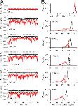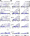 Figure 9. Slo3 activation time course is defined by two exponential components. In A, the Slo3 activation time course is illustrated for pH from 9.0 to 7.4 (top to bottom) at voltages from +40 to +240 mV. Blue lines indicate single exponential fits (I(t) = Aexp(−t/τ) + C)) to the activation time course, which at pH 7.6, 7.8, and 8.0 fails to describe the activation time course. In B, the same traces are shown on a logarithmic time axes along with either a single exponential (left traces) or a two exponential (I(t) = Asexp(−t/τs) + Afexp(−t/τf) + C; right traces) fit to the activation time course. The activation time course is best described by two exponential components. |