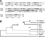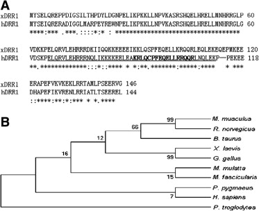 Comparison of DRR1 proteins from X. laevis (GenBank protein_id: AAH82866) with those of other species. (A) xDRR1 and hDRR1 proteins (GenBank protein_id: NP_009108) are homologous proteins. There is a coiled domain (underlined) and a signal peptide (bold) in hDRR1 protein and xDRR1. Asterisks (∗) indicate amino acid residues that are conserved across species. Colons (:) indicate strong similarity between protein xDRR1 and hDRR1. Dots (.) indicate weak similarity. (B) Phlogenetic tree of the DRR1 protein.