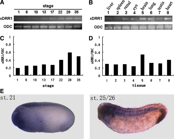 Expression pattern of xDRR1 gene in developing embryos and tissues from an adult frog. (A) Temporal expression profile of the xDRR1 mRNA detected by RT-PCR. (B) Tissue expression profile of xDRR1. The relative expression ratio of xDRR1 was shown in Xenopus different developing stages (C) and several different organs (D). The ODC expression was taken as control. (E) Spatial expression of xDRR1 using whole-mount in situ hybridization analysis. Numbers indicate developmental stage. At stage 21, expression is mainly detectable in neuroectoderm. At stages 25/26, the transcripts are present in brain, heart, notochord, and somites.