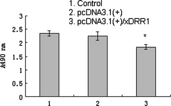 Suppression of cell growth by re-expression of xDRR1 gene. The xDRR1 plasmids were transfected into A549 cells. At the indicated time points, the cells were subjected to proliferation analysis using MTS and the absorbance detected at 490 nm. The cells transfected with the xDRR 1 plasmids were suppressed. Each bar represents the mean ± standard deviation (n = 6). âP < 0.05.