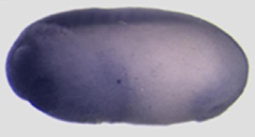 fam107a (family with sequence similarity 107 member A ) gene expression in Xenopus laevis embryo, assayed via in situ hybridization, NF stage 26, lateral view, anteriorleft, dorsal up.