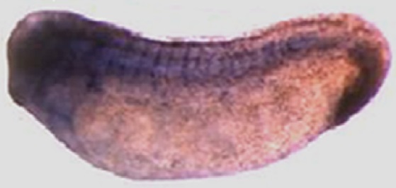 fam107a (family with sequence similarity 107 member A ) gene expression in Xenopus laevis embryo, assayed via in situ hybridization, NF stage 21, lateral view, anteriorleft, dorsal up.