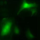 Cellular localization of the xDRR 1 protein. The A549 cells were transfected with expression vector pEGFP-N1/xDRR1, which expresses a fusion protein consisting of DRR 1 and EGFP epitope, and then detected under fluorescence microscope (×200). Included in the picture are cells which show the fusion protein (strong green) in nuclei. (For interpretation of the references to colors in this figure legend, the reader is referred to the web version of this article.