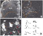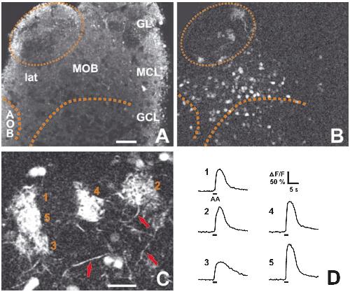 Fig. 3. Noseâbrain preparation and amino acid-induced calcium signals in individual glomeruli in the lateral glomerular cluster of the MOB. (A) Fluo-4-stained OB of a noseâbrain preparation. The dotted lines indicate the approximate borders of the accessory OB and the mitral and granule cell layer in the MOB and