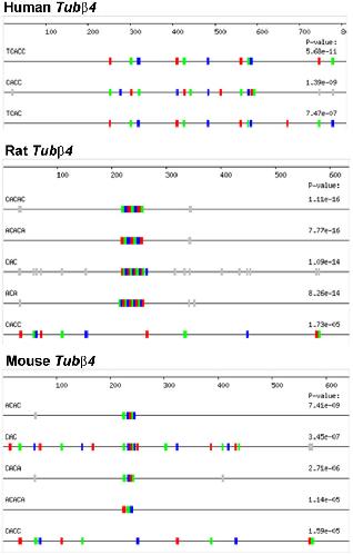 Figure 4. Mouse, Rat, and Human Tubβ4 3'-UTRs all have an abundance of CAC-containing motifs. Even though the human Tubβ4 3'UTR has little sequence similarity when it is aligned with the mouse or rat orthologs, all three genes are shown to have a highly significant number of CAC motifs when individually assessed by REPFIND. For the rat and mouse sequences, REPFIND was performed without filtering low complexity regions and the human background was used. The accession number for the mouse Tubβ4gene is BC054831. Motifs depicted in grey would have yielded higher (less significant) P-values, and therefore were not used to generate the P-values shown.