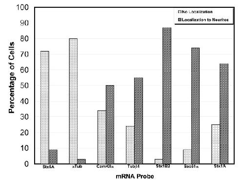 Figure 8. Semi-quantitative analysis of the localization of endogenous mRNAs. To estimate the extent of localization of each endogenous mRNA, images were collected from 30–40 cells using identical laser settings from the same experiment shown in Figure 7. All raw images were assembled into a montage and a threshold was applied to help identify mRNA labelled in distal processes. A cell was considered to be positive for localization if mRNA could be detected in a process greater than 40 μm away from the cell body. If no signal could be detected greater than 10 μm away from the cell body the cell was considered to be negative for mRNA localization. About 15–30 percent of all cells showed some signal in processes 10–40 μm away from the cell body. These cells were excluded from the graph since they added little information to this analysis.
