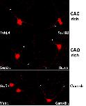 Figure 6. Verification that in situ hybridization labels specific endogenous transcripts. To verify that the in situ hybridization detects specific endogenous transcripts, average labelling of the cell bodies was quantified from more than 30 cells for each probe and compared to a non-specific (NS) RNA probe. Error bars show standard error of the means. The Student t-Test shows all probes produce much stronger labelling in the cell body than observed with the non-specific probe (P < 0.0001) which was not different than labelling seen when the RNA probe was completely omitted from an otherwise identical protocol (data not shown). The in situ procedure used for these studies was adapted from a previous study [34]and involved hybridization of a digoxigenin-labelled RNA probe, labelling of this probe with an anti-digoxigenin fluorescein-conjugated antibody followed by amplification with a secondary Cy3-conjugated mouse monoclonal anti-fluorescein antibody. All images were acquired on a Zeiss LSM 510 confocal laser scanning microscope.