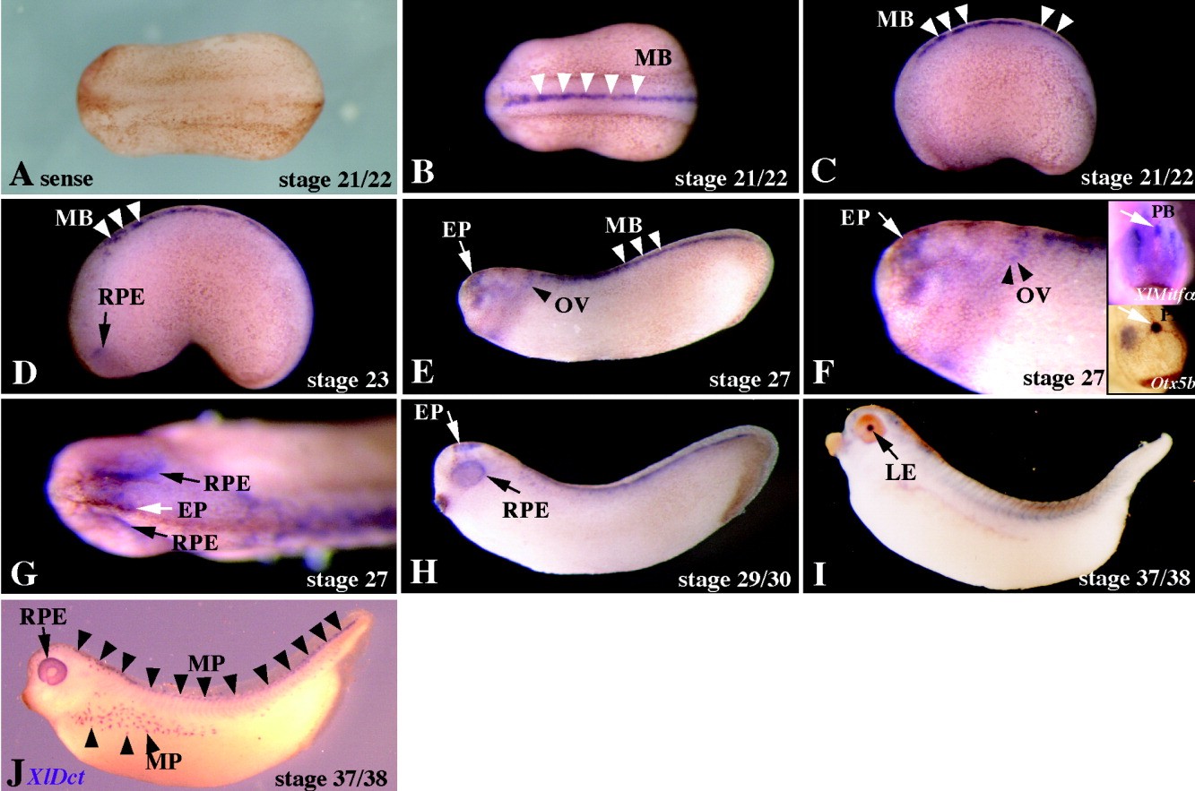 Figure 2. Expression patterns of XlMitf alpha . A: No hybridization signal was obtained with a sense RNA probe (data not shown for other stages). XlMitf alpha expression is first detected in a population of cells located on the neural tube that are thought to be premigratory melanoblast (B and C, arrowheads) at stage 21/22. B,C: B is a dorsal view of C. D: At stage 23, XlMitf alpha expression is detected in the prospective retinal pigment epithelium (arrow). E-G: At stage 27, XlMitf alpha expression is detected in the otic vesicles (E and F, black arrowheads) and in the epiphysis (E, F, insets in F, G, white arrow). The insets in F show a frontal view of XlMitf alpha and XOtx5b (marker of epiphysis) expression. White arrows show the prospective epiphysis. H: At stage 29/30, XlMitf alpha is strongly expressed in the RPE (black arrow) and epiphysis (white arrow). I: At stage 37/38, XlMitf alpha expression in both melanoblasts and RPE decreases and is almost undetectable. In contrast, XlMitf alpha expression in the lens is detectable at stage 37/38 (black arrow). J: XlDct-expressing cells show melanophores (arrowheads) and RPE (arrow). C-F,H-J show lateral views; A,B,G, dorsal views; insets in F, frontal views. In A-J, left is anterior; F,G, higher magnifications of E. EP, epiphysis; LE, lens; MB, melanoblast; MP, melanophore; OV, otic vesicle; RPE, retinal pigment epithelium.