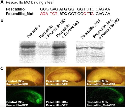 Fig. 3. Characterization of an antisense morpholino oligonucleotide directed against Xenopus laevis pescadillo. (A) Binding site of the pescadillo MO within the pescadillo mRNA. The ATG start codon is highlighted. Sequence of the pescadillo_Mut RNA in which 9 nucleotides have been changed as indicated in red. (B) Coupled transcription and translation using radioactively labeled methionine. Plasmids encoding pescadillo or pescadillo_Mut were used as indicated. Morpholino oligonucleotides were added as indicated. Pescadillo MO but not a control MO interferes with translation of the pescadillo RNA. Pescadillo MO does not block translation of Pescadillo_Mut. (C) Efficiency of pescadillo MO was also tested in whole embryos. Oligonucleotides representing the sequences as given in panel A were cloned in frame to and in front of GFP. RNA coding for the corresponding constructs (pescadillo-GFP or pescadillo_Mut-GFP) was injected together with pescadillo MO or control MO as indicated. GFP expression was monitored at stage 25. Pescadillo MO but not control MO interfered with translation of Pescadillo-GFP. Pescadillo_Mut-GFP was not targeted by pescadillo MO.