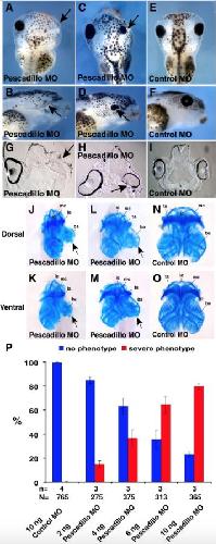 Fig. 4. Loss of pescadillo function results in severe eye and craniofacial cartilage defects. (AâF) Unilateral injection of pescadillo MO but not control MO into one dorsal-animal blastomere of 8-cell stage embryos results in severe eye phenotypes. (GâI) Histological analysis of pescadillo MO injected embryos indicates strong reduction or severe morphological eye defects in comparison to control MO injected embryo. (JâO) Embryos were unilaterally injected into one dorsal-animal blastomere of 8-cell stage embryos and cultured until stage 48. Cartilage development was visualized using an Alcian blue staining. Loss of pescadillo results in cartilage defects of diverse severity that correlates with the eye phenotype. ba: Branchial arches, ta: tectum anterius, mc: Meckel's cartilage, lc: infrarostralcartilage. (P) The effect of pescadillo MO onto eye development is dose dependent. n: Number of independent experiments, N: number of embryos scored in total. Error bars indicate standard error of the mean.