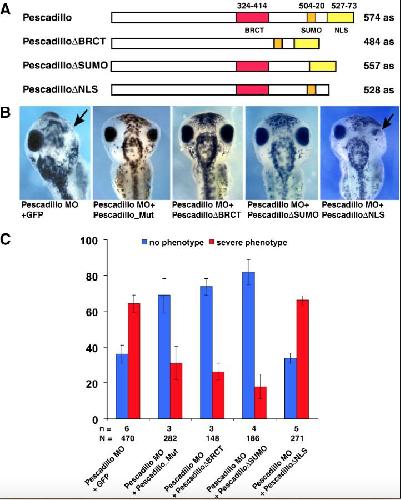 Fig. 5. Analysis of domain requirements for pescadillo function. (A) Schematic drawing of pescadillo deletion mutants. (B) RNAs coding for pescadillo_Mut, pescadilloÎBRCT, or pescadilloÎSUMO are able to revert the pescadillo MO phenotype. PescadilloÎNLS is unable to revert the pescadillo MO phenotype. The eye was used as a read out. Representative embryos are shown. (C) Statistical evaluation of described experiments. Embryos were scored for strong reduction and morphological eye defects as shown in Fig. 4 panels AâD. Mild effects on eye size were not considered to be a phenotype. n: Number of independent experiments, N: number of embryos scored in total. Error bars indicate standard error of the mean.