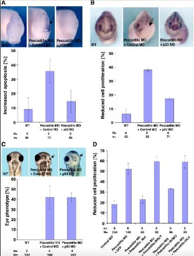 Fig. 6. Pescadillo regulates apoptosis and proliferation through p53. Embryos were injected at 8-cell stage into one dorsal-animal blastomere with pescadillo MO (6 ng), control MO or p53MO (10 ng) as indicated. (A) Embryos were analyzed for apoptosis using TUNEL staining at stage 26. A statistical evaluation of embryos with an increased apoptosis is given. Coinjection of p53 MO together with pescadillo MO can reduce the number of embryos with an increased apoptosis. (B) Embryos were analyzed for changes in proliferation by BrdU assays at stage 25. A statistical evaluation of embryos with decrease of proliferation is given. Coinjection of p53 MO together with pescadillo MO can reduce the number of embryos with decreased proliferation. (C) Coinjection of pescadillo MO (6 ng) and p53MO (10â20 ng) does not rescue the pescadillo loss of function eye phenotype. Both doses tested (10 ng, n = 2; 20 ng, n = 2) had no rescuing activity. (D) Pescadillo MO was injected unilaterally into one dorsal-animal blastomere of 8-cell stage embryos and proliferation was monitored using BrdU assay at stage 25. Embryos were scored for unilateral reduction in BrdU incorporation as shown in Fig. 5B. Coinjection of RNAs coding for pescadillo_Mut or pescadilloÎSUMO but not GFP, pescadilloÎBRCT or pescadilloÎNLS were able to rescue the pescadillo MO phenotype on proliferation. n = Number of independent experiments. N = number of embryos examined in total. Error bars indicate standard error of the mean.
