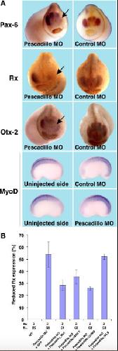 Fig. 7. Pescadillo affects differentiation within the early eye field. Pescadillo MO or control MO was injected unilaterally into one dorsal-animal blastomere of 8-cell stage embryos. (A) Expression of marker genes Pax-6, Rx, Otx-2, or MyoD was analyzed by whole-mount in situ hybridization at stage 23, as indicated. Expression of Pax-6, Rx, or Otx-2 in the eye field was reduced whereas expression of MyoD was not affected. (B) Statistical evaluation of reduced Rx expression in pescadillo MO injected embryos. Coinjection of pescadillo_Mut, pescadilloÎBRCT, or pescadilloÎSUMO but not pescadilloÎNLS was able to reduce the number or embryos with an unilateral reduction in Rx expression. n = Number of independent experiments. N = number of embryos examined in total. Error bars indicate standard error of the mean.