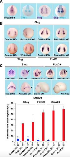 Fig. 9. Pescadillo interferes with cranial neural crest migration but not specification. (A) Whole-mount in situ hybridization indicates a partial coexpression of Slug and Wnt-4 at stage 19. Frizzled-3 is expressed throughout the whole anterior neural plate with different intensities. (B) Frizzled-3 MO but not Wnt-4 MO, pescadillo MO or control MO interferes with slug expression at stage 17. Pescadillo MO does not interfere with FoxD3 expression at stage 17. (C) Unilateral injection of Wnt-4 MO and pescadillo MO results in a neural crest cell migration defect as indicated by staining for slug (stage 20) and Krox20 (stage 23/24). In case of pescadillo MO, FoxD3 was used as an additional marker (stage 20). Staining for FoxD3 indicates that neural crest cells stay in the dorsal part of the embryo and do not migrate towards the ventral side. A statistical analysis of these experiments is given at the bottom of the panel C. n = Number of independent experiments. N = number of embryos examined in total. Error bars indicate standard error of the mean.