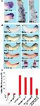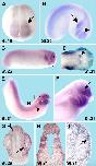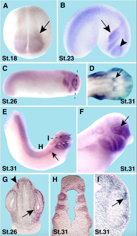 Fig. 1. Spatial expression of Xenopus laevis pescadillo. Spatial expression of pescadillo was analyzed by whole-mount in situ hybridization. (A) Specific expression could first be detected at stage 18 in neural tissue with strongest expression in the anterior neural plate (arrow). (B) At stage 23, pescadillo can be detected in migrating cranial neural crest cells (arrow) and the developing eye (arrow head). (C) Similarly, expression of pescadillo at stage 26 can be detected in the neural crest cells and the eye. Dashed line indicates level of cross-section shown in panel G. (D) Dorsal view of an embryo at stage 31. Specific expression can be found at the isthmus, the midbrainâhindbrain boundary (arrow). (E) Expression at stage 31 persists in derivatives of cranial neural crest cells, the eye and the pronephros (arrow). White dashed line indicates level of section as indicated in panel H, whereas the black dashed line indicates level of section as shown in panel I. (F) Magnification of an embryo at stage 31. Pescadillo expression is enriched in the region of the ciliary marginal zone of the eye (arrow). (G) Transverse section of an embryo at stage 26. Expression of pescadillo can be found in the isthmus (arrow head) and outer layer of the eye, the periocular mesenchyme (arrow). (H) Horizontal section at stage 31 indicates expression of pescadillo in the branchial arches. (I) Horizontal section at stage 31 indicates expression to be likely within the periocular mesenchyme (arrow).